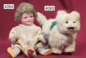 HEUBACH Einko, (Eisenmann & Co.)Googly, seltene Googly-Variante, Halsmarke 8723, Einko Heubach Germany im Quadrat, Biskuit-Porzellan-Kurbelkopf, große blaue Glasaugen, mit Metall-Mechanismus zum Drehen der Augen, von links nach rechts am Hinterkopf, 5-teiliger Kompositionsbabykörper, schönes altes Seidenkleid, mit dazu passendem Häubchen, lt. C. a. Stanton ist dieses Googly ein Teile der sogenannten Kiddieland Serie und wurde dort als Babygirl im Verkauf angeboten, ca. 1912, 25 cm, Körper bespielt, kl. Stellen ausgebessert