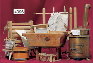 Waschset, Wäschekocher, 31,5 cm, innen Brennraum doppelwandig, mit Wasserablasshahn, Wassertopf innen vernickelt, Löwentatzenfüße, dazu eine Holzwaschschüssel, Reibe, Körbe, Wäscheklammern, sehr schöne Puppendeko., um 1900, dazu 1 Wäschemangel