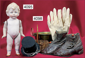 Puppen-Ausschmückungsteile, Messingschale, Durchm. 12,5 cm, kl. Zylinder für Kopfdurchm. 5 cm, 1 Paar Kinderschuhe, Handschuhe, 1 Korb