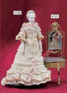Biskuitporzellan-Brustblattkopf-Puppe, Nr. 7, 40 cm, fein ausmodellierte Haare, anmodelliertes Haarband, blaue fest eingesetzte Glasaugen, geschl. Mund, Lederkörper, Masse-Arme, durchst. Ohren, kl. Brandfleck auf der Stirn, Nasenspitze etwas berieben, ausdrucksstark