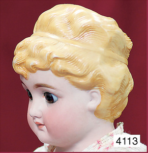 KLING 251, Biskuitporzellan-Brustblattkopf-Puppe, 46 cm, Brustblattkopf, braune fest eingesetzte Glasaugen, geschl. Mund, fein ausmodellierte blonde Haare, Lederkörper, bespielt, Lederstiefel, 3 Finger fehlen