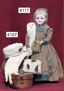 GAULTIER Biskuitporzellankopf-Puppe, gemarkt F7G, 42 cm, gepresster Biskuit-Kurbelkopf, blaue fest eingesetzte Paperweightaugen, leicht off./geschl. Mund, mit leicht angedeuteter Zunge, Kinngrübchen, durchst. Ohren, Ohrlöcher ausgebessert, kl. Glasurlinie auf der Stirn unter der Perücke, Lederkörper, Biskuit-Unterarme, schöne alte Kleidung, Unterkleidung u. Schuhe, Daumen an der li. Hand ausgebessert, alte Mohairperücke, alter Korkdeckel
