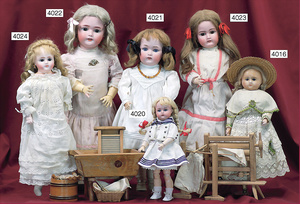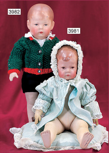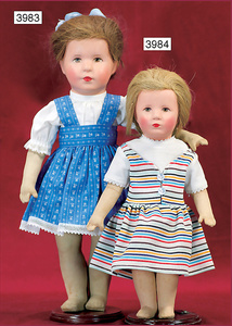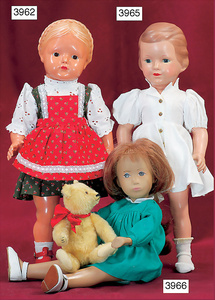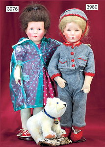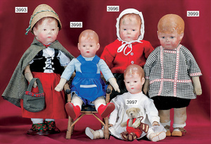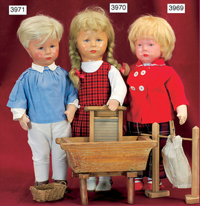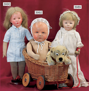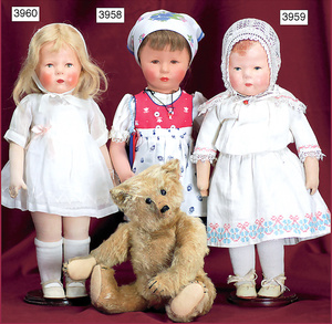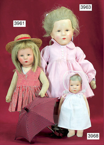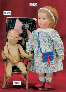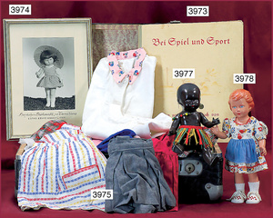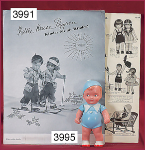 KÄTHE KRUSE Konv., 3 Teile, Nr. 1, Einblattprospekt, 1935-36, gelocht, im Knick eingerissen, Nr. 2, 4-seitiges Faltprospekt, 1938-39, Firmenname überklebt, mit ca. 60 Abbildungen aus der Käthe Kruse Produktion, Nr. 3 Käthe Kruse Pflegeanleitung 4-seitige Broschüre, sehr guter Zust.,