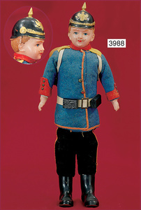 SCHILDKRÖT Einbindekopf-Soldat, 32 cm, Celluloidkopf, mit ausmodellierten Haaren, Schnurrbart u. anmodellierte Pickelhaube, Celluloid-Arme u. -Stiefel, Orig.-Kleidung, mit Tornister, ausgefallen, guter Zust.