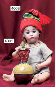 KESTNER kl. Googly, 10,5 cm, Ganzbiskuit, Kurbelkopf, braune seitl. blickende Schlafaugen, geschl. Melonenmund, Mohairperücke etwas ausgegangen, Orig.-Gipsdeckel, bewegl. Arme u. Beine, anmodellierte Schuhe u. Strümpfe