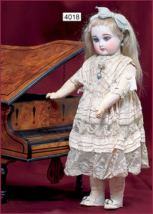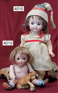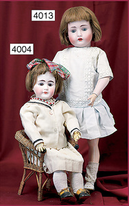 Biskuitporzellankopf-Puppe, gemarkt 1004, 46 cm, Kurbelkopf, braune fest eingesetzte Glasaugen, geschl. Mund, auf Biskuit-Brustblatt, Lederkörper, bespielt, Biskuit-Unterarme, alte Kleidung, Kleid altersb. verschlissen, Perücke neuer, einige Ofenstaubeinschlüsse im Gesicht, Kopf wirkt etwas klein zum Körper