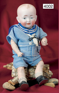 K&R Biskuitporzellankopf-Puppe, 33 cm, Biskuit-Kurbelkopf, blaue Schlafaugen, off. Mund, oben Zähne, ausgeformter Gliederkörper, alte Matrosenkleidung, Perücke neuer