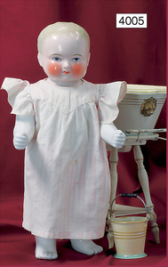 KESTNER Biskuitporzellan-Charakterbaby, JDK 311, 28 cm, Kurbelkopf, blaue Schlafaugen, off. Mund, Zähne u. Zunge, ausgeformter Sitzbabykörper, mit untersch. Handhaltung, Körper bespielt, ausgebesserte Stellen am Halsausschnitt, (Pappschale hat sich gelöst), Fehler ausgebessert