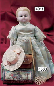 Biskuitporzellankopf-Puppe, Belton Typ, gemarkt 4, 32 cm, Kurbelkopf, blaue fest eingesetzte Glasaugen, geschl. Mund, durchst. Ohren, früher Gliederkörper mit festen Handgelenken, schöne alte Kleidung, alte Schuhe, alte Mohairperücke, Seide am Kleid altersbed. verschlissen