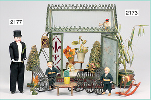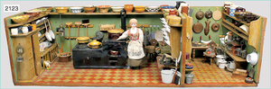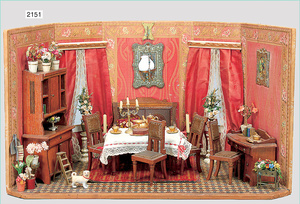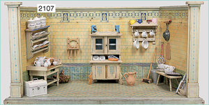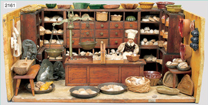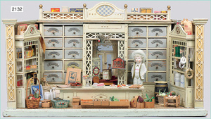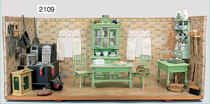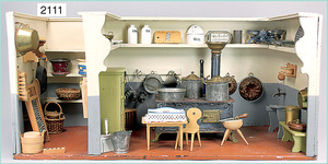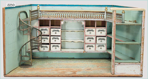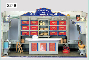 GOTTSCHALK Puppenstube, 71 cm breit, 36 cm hoch, 28 cm tief, verzierte Frontleisten, Schubladen mit Porzellan-Schildern, Orig.-Theke, teilw. farblich überarbeitet, alte Tapete an Wand u. Boden, Zubehör teils alt, teils neuer