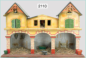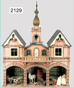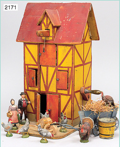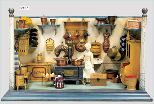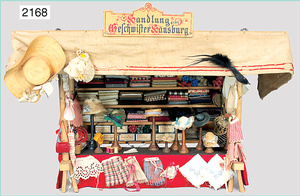 HACKER Kaufladen, ca. 1890, 72,5 cm breit, 35,5 cm hoch, 27 cm tief, Schubladen mit lithogr. Papier beklebt (Bouleornamente), Papier an 3 Schubladen fachgerecht ergänzt, Orig.-Tapete am Boden, vorne 2 Schaufenster, mit Theke, Orig.-Bemalung, kl. Stellen farblich ausgebessert, mit Zubehör, (meist alt, ein paar Teile neuer) in einer alten Holzkiste, wohl Orig.