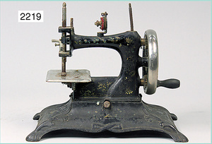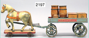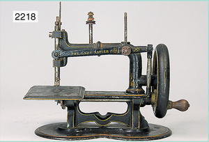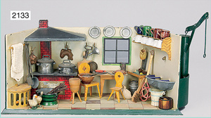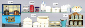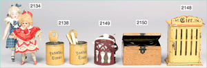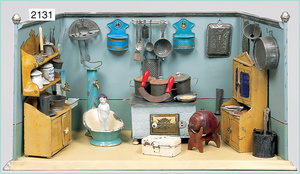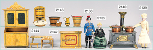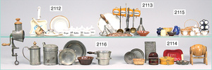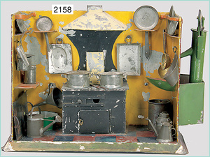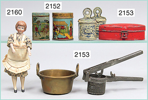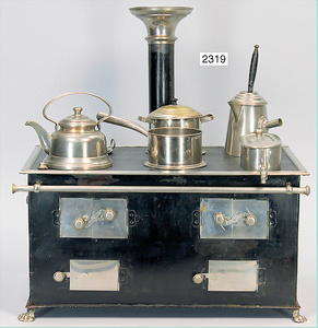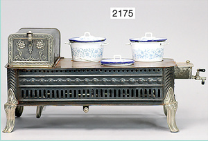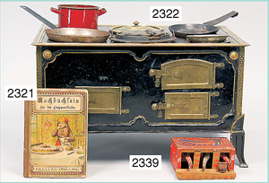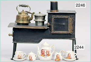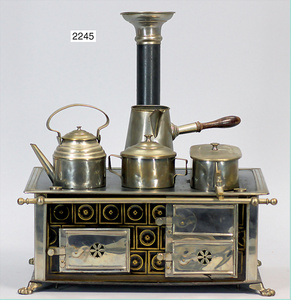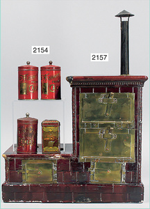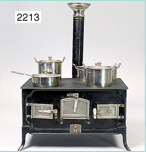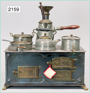 Puppenküchen-Herd, ca. 1890, 30 cm breit, 31 cm hoch, Löwentatzenfüße, Messing-Türen mit Griffstange, auflithogr. Kachelmuster, 4 Töpfe, Wasserkessel, Schornstein, Töpfe größenmäßig passend, jedoch nicht alle Orig. zum Herd zugehörig