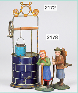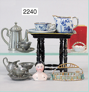 Konv. Zinn, Waschschüssel, mit Halter, 1 Ständer, Schippe, kleiner Kinderwagen, Höhe 7 cm, Zust. 2