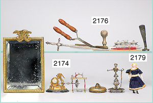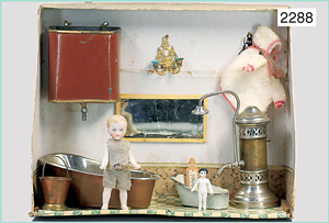 Badezimmergarnitur, bestehend aus frühem Badeofen, teils Messing, teils Blech vernickelt, 18 cm, mit Brenner, dazu 2 Wannen, 2 Badepuppen, 1 kl. Gehäuse Presspappe, 27 cm hoch, 33 cm breit, Spiegelglas hinten gerissen