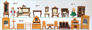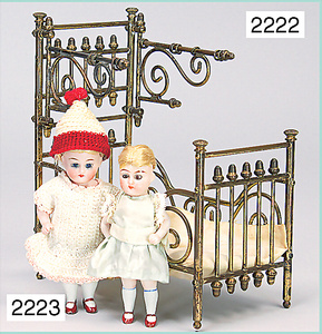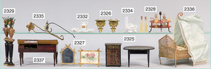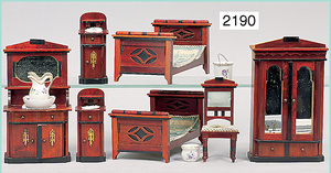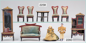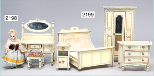 Puppenstuben-Schlafzimmerprogramm, Kleiderschrank, 15,5 cm, Spiegelkommode, 2 Betten, 2 Nachtschränkchen, mit aufgesetzten Jugendstilverzierungen aus Zinn, gold
