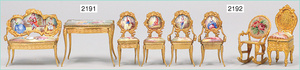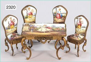 Sitzgruppe, Messing/Blech vergoldet, mit Emaillebildern, Tisch 8 cm x 6 cm, dazu passend 4 Stühle, für kl. herrschaftl. Stube