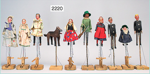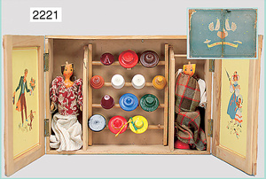 Konv. Kasper´l-Puppen, 6 Figuren, Kasper, Teufel, König und Königin, Soldat, Schutzmann, Holz lackiert, dazu 1 Krokodil, 1920, dazu Gehäuse, bemalt, bedruckte Vorhänge, "Direktion u. Spielleitung", Gisela Deister, Eintritt 12 Pfg., Naturalien werden auch in Zahlung genommen, 70,5 cm x 50,5 cm x 29,50 cm