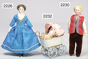 3 Teile Puppenstuben-Puppen, 6 cm - 10 cm, 2 x Ganzbiskuit, 1 x Biskuit-Brustblattkopf, -arme und -beine, Stoffkörper