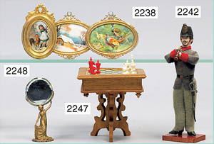 Zeitungshalter, vor 1900, Pappe geprägt, 7,5 cm, mit Orig.-Puppenzeitung und Kalender, für 1894, 1 Bürstenhalter, 1 Bürste fehlt, 8 cm, Stoff, schönes Konv.