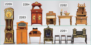 GOTTSCHALK Möbelprogramm, dunkelrot/gold, Presspappe, Schrank, Höhe 11,5 cm, Bank, Breite 10,5 cm, Füße weggebrochen, 3 Stühle, Sessel, 1 Bein weggebrochen, Tisch, Schreibtisch, einige Farbabplatzer