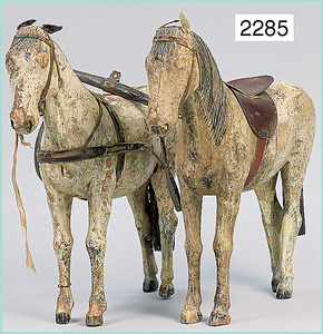 2 Pferde, Holz geschnitzt, wohl vor 1900, 30 cm, 1 x mit Sattel, 1 x mit Zaumzeug, altersbed. Lackfehler