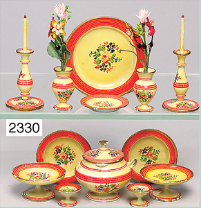 ERZGEBIRGE Speiseservice, 28-teilig, Blumendekor, Suppenschüssel, 4,5 cm Durchm. 1 Henkel fehlt, Suppenteller, Essteller, Vase, Kerzenleuchter, Anbietschale, sehr guter Zust., feines Dekor., selten in diesem Umfang, für herrschaftl. Puppenstube, im Orig.-Kart., Zwischenlagen des Kart. fehlen