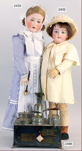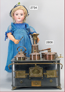 Puppenküchenherd, 35,5 cm, Messing-Löwentatzenfüße, Wasserschiff mit Hahn, Kakaokocher mit Quirl, Wasserkocher, Topfpfanne, Topf mit Deckel, Orig.-Schornstein, schöner Orig.-Zust.
