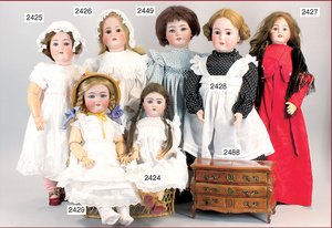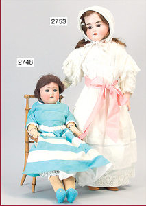 Porzellan-Brustblattkopf-Puppe, gemarkt Germany, Kopf seitl. geneigt, braune fest eingesetzte Glasaugen, off. Mund, Zähne, Echthaarperücke fest aufgeklebt, von außen keine Risse erkennbar, Lederkörper, Porzellan-Unterarme, 60 cm, alte Kleidung u. Schuhe