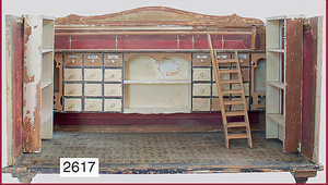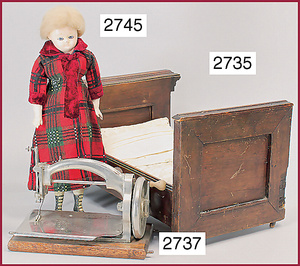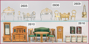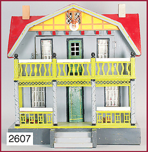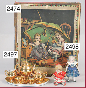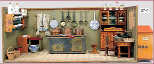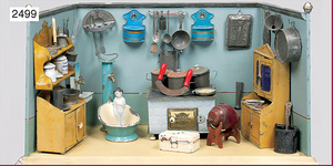 Puppenstuben-Küche, 1895, 83 cm breit, 31 cm hoch, 41 cm tief, Orig.-Bemalung, möbliert, Möbeldekor Brandmalerei, mit Herd, Schornstein am Herd fehlt, schönes reichhaltiges Zubehör aus d. Zeit, Porzellan, Keramik, Blech, emailliert, 1 Teedose lithogr., einige Messing-Pfannen, Fensterglas gesprungen, Stühle mit eingrav. Namen der Geschwister Sophie u. Elisabeth, ausgefall. Außenbemalung, mit Szenen von Wilhelm Busch, seitl. Apport, Lokus-Häusschen, mit Inneneinrichtung, Dachbodenfund, unberührter Orig.-Zust.