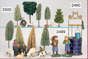 ELASTOLIN Wandersmann, mit Korb u. Schirm, 8 cm, 1 Bäuerin, 9,5 cm, Masse, ungemarkt, kl. Affe, 6 Nutztiere, 1 Krippenfigur, Masse, Zust. 2, einige Lufabäume