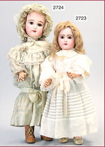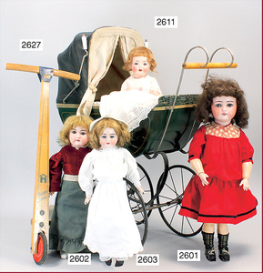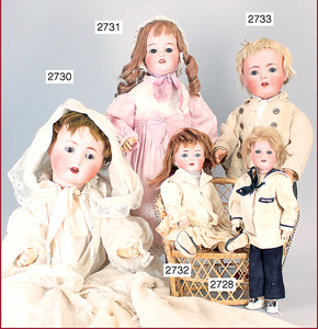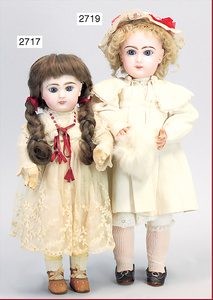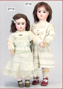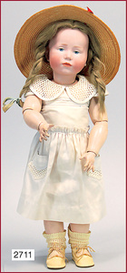 SCHOENAU & HOFFMEISTER Porzellankopf-Puppe, gemarkt 1923, blaue Schlafaugen, off. Mund, Zähne, Mohairperücke fest aufgeklebt, bitte Transportrisiko für den Augenmechanismus beachten, von außen keine Risse erkennbar, Masse-Gliederkörper, 46 cm