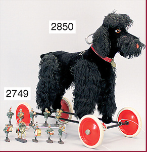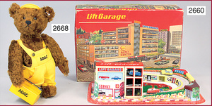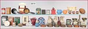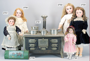 Puppenherd, Blech, Firma Fuchs, bespielt, im Orig.-Kart., dazu einige Töpfe, Weißblech, unbespielt