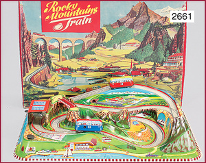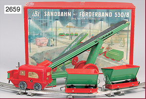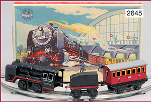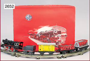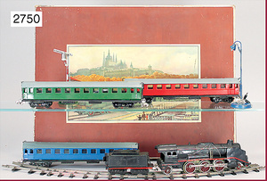 Zugpackung, Schmalspur, Stand 2,5 cm, bestehend aus Schlepptender-Lok 2 C 1, elektr. Ausführung, drei 4-achsige Personenwagen, 28 cm, Gleismaterial, Lampen, Signalzubehör, guter Zust., techn. nicht geprüft, Orig.-Kart. mit lithogr. Deckbild