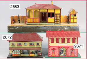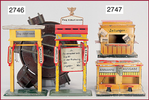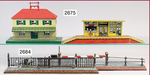 KIBRI 2 Teile Gepäckannahme/-ausgabe-Häuschen, Blech lack.,Grundplatte 15 x 11 x 10 cm, Lichtanschluss, stärkere, altersbed. Lackabplatzer, bespielt, Zeitungskiosk, Blech, handlack., Länge 13 cm, Breite 9,5 cm, gr. Tür hinten, alte Zeitungen, altersbed. Lackabplatzer, guter Zust.
