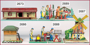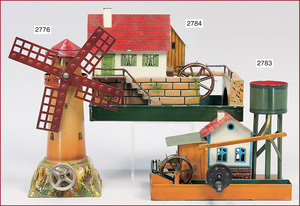 3 Dampfmaschinen-Antriebsmodelle, Blech, bespielt, altersbed. Roststellen, Farbabplatzer, 1 Schöpfwerk, 1 Lötstelle gebrochen, Mann mit Hammer, 1 Mühle (Fleischmann)