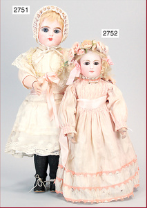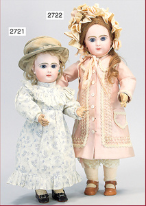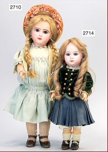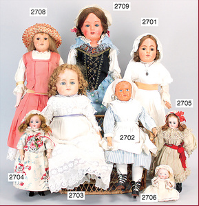 GAUTIER Porzellankopf-Puppe, gemarkt 7, blaue fest eingesetzte Paperweightaugen, geschl. Mund, durchst. Ohren, kl. Chips an den Ohrlöchern, Mohairperücke, Masse-Gliederkörper, Farbabrieb an den Fingern, 47 cm, alte Kleidung u. Schuhe