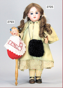 RABÈRY & DELPHIEU Porzellankopf-Puppe, gemarkt 2/0, braune fest eingesetzte Glasaugen, geschl. Mund, durchst. Ohren, Mohairperücke mit Korkdeckel, franz. Gliederkörper, mit festen Handgelenken, 37 cm, alter Federaufzug, Kleidung alt o. aus alten Stoffen genäht, alte Lederschuhe Gr. 5