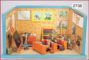ELASTOLIN Schule, 49 cm breit, 26 cm hoch, 27 cm tief, Bänke u. Tafel orig., Pult, Bodenplatte ergänzt, Figuren neuer, Stubengehäuse als Schule eingerichtet