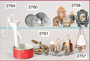 schönes Konv. Puppenstuben-Ausschmückungsteile, kl. Waage, Länge ca. 8 cm, kl. Badethermometer, Schaufel, Besen, Bürste, einige Besteckteile, 1 Zinnlampe mit Glasschirm, 5 cm,kl. Kompass, u. anderes