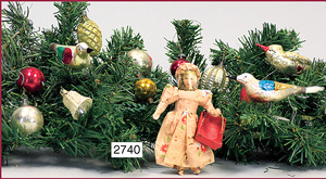 Konv. Christbaumschmuck, Kind mit Korb, Krepppapier, Kleid, Oblatenbildergesicht, 11,5 cm, einige kleinere Kugeln, Watte u. Spiegelglas, einige Glocken u. Zapfen, 3 Vögel, ca. 30 Teile