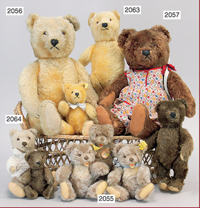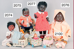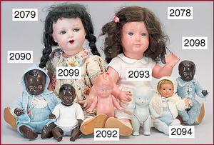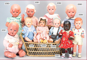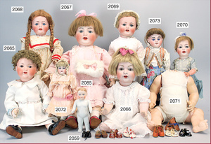 K & R Porzellankopf-Puppe, gemarkt Simon & Halbig 126 Germany, blaue Schelmenaugen, off. Mund, Zähne, Zunge, Echthaarperücke fest aufgeklebt, von außen keine Risse erkennbar, bitte Transportrisiko für den Augenmechanismus beachten, Augenlider überstrichen, auf Masse-Toddlerkörper, mit Stimme, 70 cm, alte Kleidung, Schuhe, 1 Fellmuff