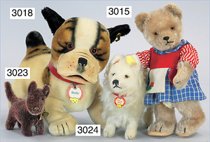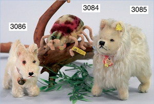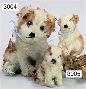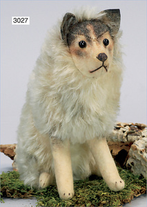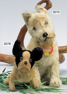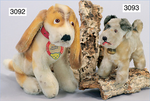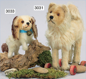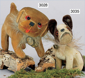 STEIFF Zwergspitz, hergestellt um 1935-1943, mit Knopf, Brustschild und Fahne, stehend, langhaariges Mohairplüsch, sehr schöner Zust.