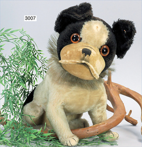 STEIFF Bully, sitzend, ca. 1927, 41 cm, mit Knopf und Reste der roten Fahne, schwarz/weiss, drehbarer Kopf, Halskrause mit original Steiffknöpfen, kl. Stelle auf der Stirn Mohairverlust, sonst schön, ausgefallen