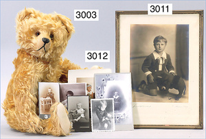 STEIFF Molly, ca. 1925, 28 cm, mit Knopf, Metallringschild und unbespielter roter Fahne, Nr. 3330,1, sitzend, drehbarer Kopf, langes graues schattiertes Mohair, sehr guter Zust., dazu eine Postkarte mit Baby und Steiff-Molly, schönes Teil