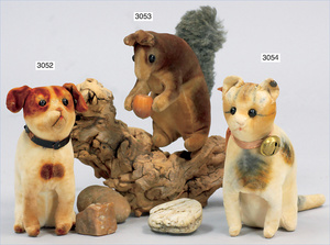 STEIFF Eichhörnchen, ca. 1903, mit Knopf, 10 cm, freistehend, Samt weiß/braun bemalt, grauer Wollschwanz, Schuhknopfaugen, echte Haselnuss zwischen den Händen, außergewöhnlich selten, unbespielter Zust.