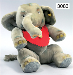 STEIFF Jumbo, Elefant, mit Knopf, Schild und Fahne, Nr. 0520,35, unbespielt, sitzend, 33 cm, drehbarer Kopf und Arme