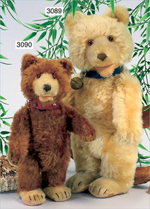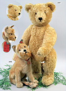 STEIFF Orig.-Bär, mit Knopf, Schild und Fahne, Nr. auf der Fahne 5340,01, gold/gelb, minimale Fehler an den Filztatzen, schönes volles Mohair, Glasaugen, kl. angesetzter Buckel, 35 cm, schöner Ausdruck
