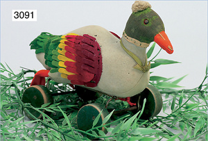 STEIFF Ente, ca. 1905, auf Holzrädern, beschriftet mit Steiff, Made in Germany, buntes Filzgefieder, Seidenplüschkopf