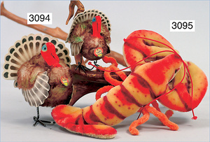 STEIFF Truthahn, Pärchen, 1x völlig unbespielter und unberührter Truthahn Tucky, mit Knopf, Schild und gelber Fahne, Nr. 1310,00, 10 cm, 1 x Truthahn, Tucky, mit Knopf, Schild und Fahne, Nr. 1314,00, unbespielt, 16 cm, schöne kräftige Farben