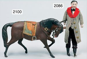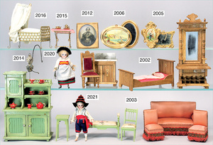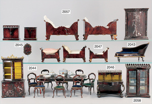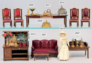 außergew. Puppenstube, ca. 1870, 1,35m breit, 62 cm hoch, 83 cm tief, eingerichtet mit Modellmöbeln, außergew. Sitzgruppe, Sofa, 4 Stühle, Tisch, Durchm. 22 cm, Eckschrank, 31 cm, dazu Manufaktur-Ofen, früh, 20 cm Höhe, Spieltisch, Bett mit altem Bettzeug, Waschtisch mit Schachbrettmuster und Würfeln, außergew. Schaukelpferd, 26 cm, Körbe, Bilder, Glasteile, Besteckteile, sehr schöne Gr., sehr gut geeignet als Dekorationsstück für Modepuppen, ein Museumsstück mit besonderer Ausstrahlung
